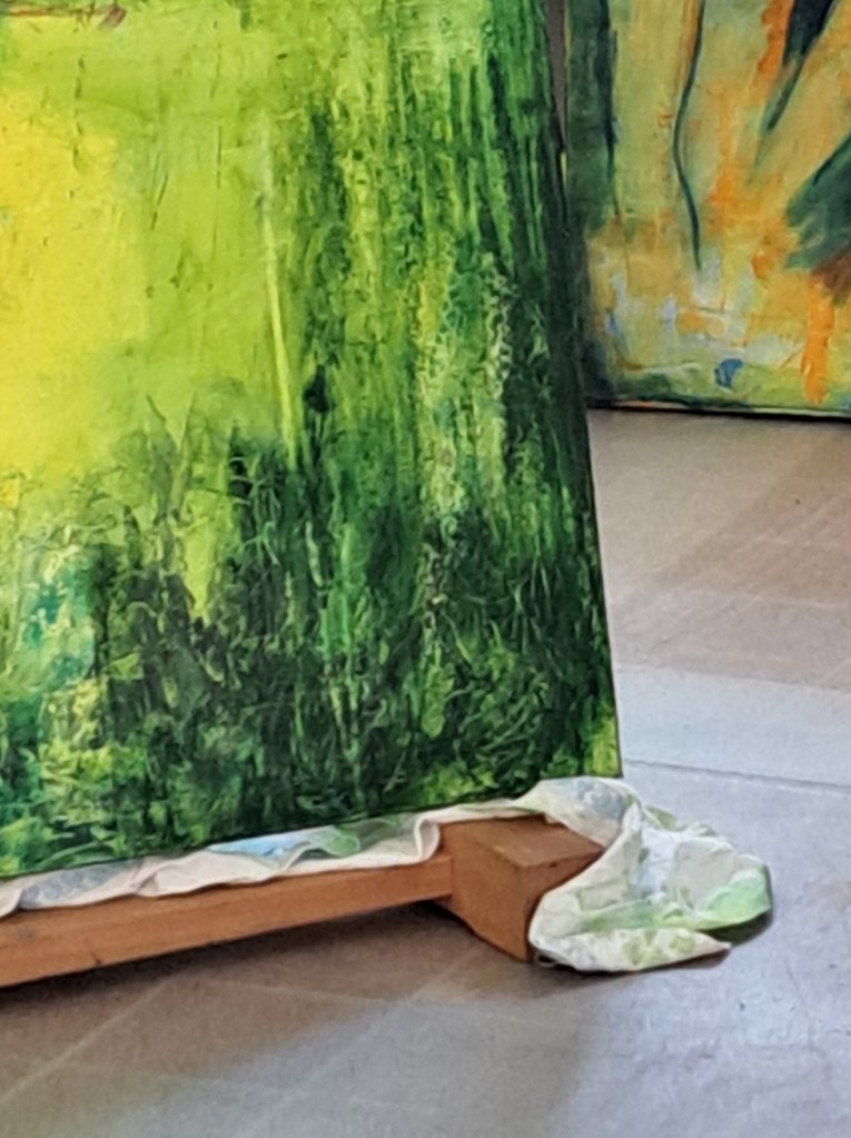 Att skapa ett konstverk är en process som måste få ta den tid som behövs. Ibland går det lätt, ibland tar det tid. Dessa två verk ni ser på bilden har tagit lång tid på sig, den främre har fått nya kulörer, den bakre kan tänkas få nya sådana.