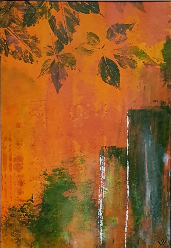 Den senaste sålde jag i veckan, och den var en av de mest omtyckta på min separatutställning Kulörer på NK-villan. Min vän som köpte den hade fastnat för den redan under utställningen, kom tillbaka på fredagskvällen då jag hade öppet i ateljén under LitterArt-helgen och kollade, och på lördagen ringde hon och ville köpa den alternativt en annan av mina tavlor. Gröna ”pluppar” kom genast upp på väggen för att markera att de var reserverade. Häromdagen åkte jag till henne med tavlorna för att kolla vart ett konstverk skulle kunna passa bra att hänga upp, och köpet genomfördes. Som bonus blev jag och maken bjudna på en mycket god lunch!